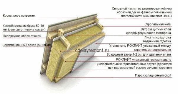 O isolamento do telhado é em muitos aspectos semelhante ao isolamento da parede. Para isso, via de regra, são utilizados os mesmos materiais e tecnologias, mas também com algumas nuances. A sequência de instalação correta é importante aqui. Obviamente, um telhado de alta qualidade e instalado corretamente é de suma importância. Deve ser aplicada uma película impermeabilizante permeável ao vapor, além de possuir propriedades à prova de vento. Em seguida, uma camada de isolamento é colocada, seguida por outra membrana à prova de vapor. Também deve haver um pequeno espaço para ventilação, o que ajuda a evitar umidade excessiva no ambiente. Depois disso, tudo isso é coberto com compensado, drywall ou qualquer outro material adequado.