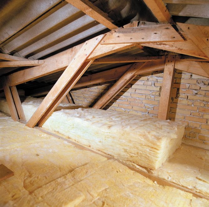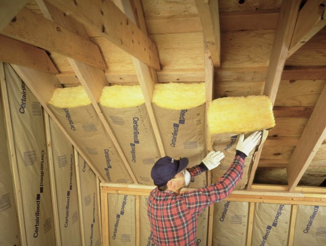m) e fibra de vidro básica. Para fixação adicional de materiais fibrosos, extensões de linha de pesca ou corda também são usadas. Se a altura das vigas não for suficiente para colocar o isolamento com a espessura necessária, ela é aumentada enchendo-se adicionalmente a madeira até as vigas.