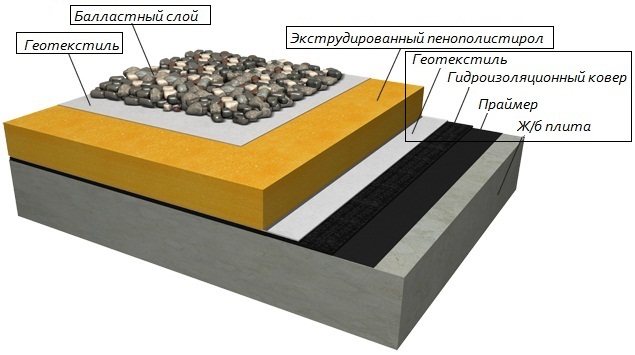 - Após a conclusão destes trabalhos, tudo é coberto por cima com uma camada de material isolante térmico (espuma, lã de pedra, espuma de poliestireno extrudido, etc.), sobre a qual é colocada uma camada de fibra de vidro ou geotêxtil.