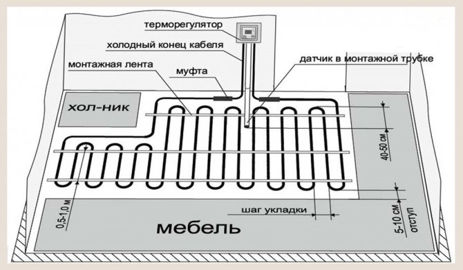Após a seleção do cabo, é necessário calcular o passo de assentamento para seu assentamento uniforme. O espaçamento de colocação é a distância entre as linhas paralelas do cabo de aquecimento.