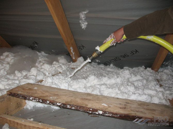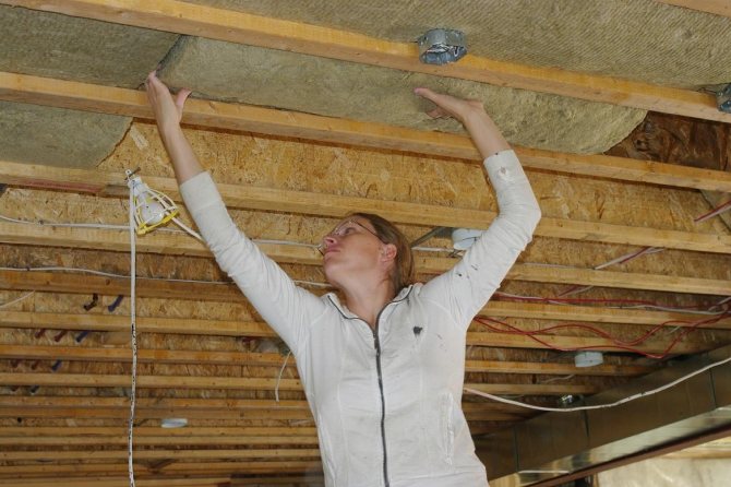 - É necessário colocar o isolamento um pouco abaixo das paredes, deixar espaço para colocar materiais a granel ou lã mineral. É necessário preencher pequenas laterais ao longo do perímetro do teto.