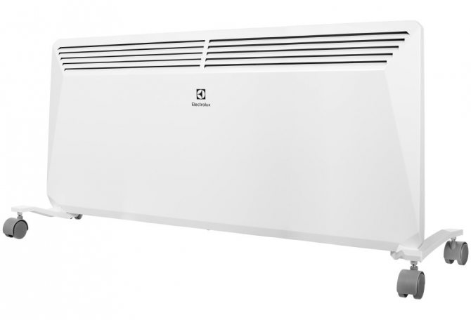 tem duas opções de colocação: estacionário (fixo na parede) e chão (instalado em pés especiais com roletes para movimentação móvel de sala em sala). O conjunto completo de cada convector inclui todos os elementos necessários à sua instalação. O suporte de montagem na parede tem uma etapa adicional de proteção - são travas de plástico que evitam que o dispositivo caia, mesmo se, devido a um choque ou empurrão forte, ele cair acidentalmente do suporte de montagem. As rolhas de plástico de proteção permitem inclinar o convetor para a frente e limpar a parede e o próprio convetor da poeira sem desmontar o dispositivo. Para instalação no solo, o convector é fornecido com pés com rodízios. Os engenheiros da Electrolux trabalharam cuidadosamente e fortaleceram seu projeto, aumentando a estabilidade e a confiabilidade da colocação do aparelho elétrico no chão. Qualquer uma das opções de instalação do aquecedor levará apenas alguns minutos.
