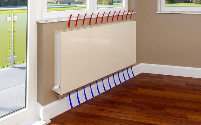 O princípio de funcionamento é compreendido por qualquer aluno que frequentou aulas de física. O ar entra no convector através das aberturas na parte inferior da caixa, tocando Elemento de aquecimento, ele aquece e sobe, criando assim a circulação e o movimento contínuo de massas de ar frio através do elemento de aquecimento.