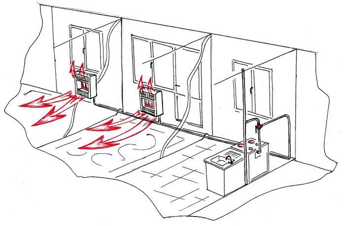 O princípio de funcionamento de tal dispositivo é idêntico ao suspenso e baseia-se na convecção, quando o ar frio empurra para cima quente, tendo uma densidade inferior. Ou seja, para que o aquecimento comece, é necessário colocar em funcionamento uma fonte de calor (não só a água, mas também o gás e a eletricidade podem atuar como portadores de calor), que, em contato com as massas frias, aquecerá -los para cima e empurrá-los para fora.