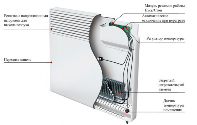 Estruturalmente, um convetor elétrico é composto por uma caixa de metal (na maioria das vezes alumínio), um elemento de aquecimento do tipo fechado, um termostato, sensores, um dos quais mede a temperatura externa, e o segundo é responsável por desligar o aparelho em caso de superaquecimento.