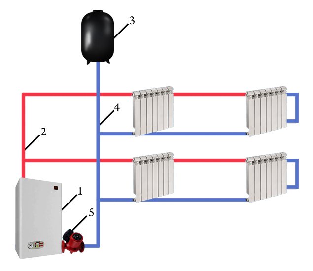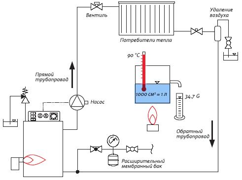 Um gerador de calor em tal sistema pode ser um aquecedor elétrico padrão ou uma caldeira de aquecimento operando com gás e combustível sólido.