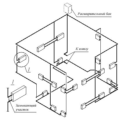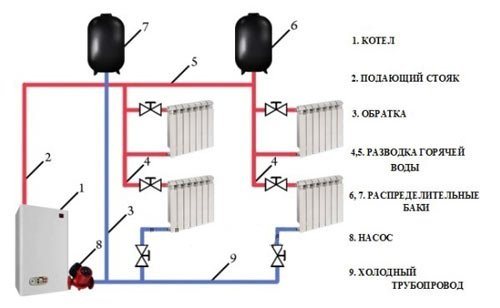 Um tanque expandido (reservatório) é instalado no sótão do prédio, que deve ser bem isolado. Risers são adequados para isso, o que leva a uma fonte de calor e radiadores. Quando o refrigerante esfria, ele sai frio através de tubos localizados horizontalmente (rede elétrica).