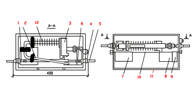 A Figura 2 mostra um transdutor para tal medidor de fluxo. O campo gerado por um magnetron contínuo 3 do tipo M-857 com uma potência de 15 W é alimentado através de um guia de ondas 2. A parte inicial do guia de ondas para resfriamento é equipado com aletas 12. O líquido medido se move através de um tubo fluoroplástico 1 (diâmetro interno 6 mm, espessura da parede 1 mm). O tubo 1 é conectado aos bocais de entrada 5 por meio de bicos 4. Parte do tubo 1 passa dentro do guia de onda 2. No caso de líquidos polares, o tubo 1 cruza o guia de onda 2 em um ângulo de 10-15 °. Neste caso, a reflexão da energia do campo pela parede do tubo e pelo fluxo do fluido será mínima. No caso de um líquido fracamente polar, para aumentar sua quantidade no campo eletromagnético, o tubo 1 é colocado no guia de ondas paralelo ao seu eixo. Para controlar o grau de aquecimento do líquido fora do tubo, são colocados conversores capacitivos 6, que estão incluídos nos circuitos oscilatórios de dois geradores de alta frequência 7 e 8. Os sinais desses geradores são alimentados à unidade de mistura 9, a partir de em que a diferença de frequência das batidas dos sinais de entrada é tomada. A frequência desses sinais depende da taxa de fluxo. O transdutor de fluxo é montado na placa 10 e colocado em um invólucro protetor de blindagem 11. A frequência do gerador de campo de micro-ondas é selecionada no valor máximo e a frequência dos geradores de medição 7 e 8 no valor mínimo da perda dielétrica tangente tgδ.