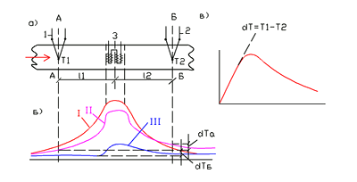 Os medidores de fluxo calorimétricos são baseados na dependência da potência de aquecimento da diferença de temperatura média da massa do fluxo. O medidor de vazão calorimétrico consiste em um aquecedor 3, que está localizado dentro da tubulação, e dois conversores térmicos 1 e 2 para medir as temperaturas antes de T1 e após T2 do aquecedor. Os conversores térmicos geralmente estão localizados a distâncias iguais (l1 = 1g) do aquecedor. A distribuição das temperaturas de aquecimento depende do consumo da substância. Na ausência de fluxo, o campo de temperatura é simétrico (curva I) e, quando aparece, essa simetria é violada. Em vazões baixas, a temperatura T1 cai mais fortemente (devido ao influxo de matéria fria) do que a temperatura T2, que pode até aumentar em vazões baixas (curva II). Como resultado, a princípio, conforme a vazão aumenta, a diferença de temperatura ΔT = Т2 - Т1 aumenta. Mas com um aumento suficiente na taxa de fluxo QM, a temperatura T1 se tornará constante, igual à temperatura da substância que entra, enquanto T2 cairá (curva III). Nesse caso, a diferença de temperatura ΔT diminuirá com o aumento da taxa de fluxo QM. O crescimento de ΔT em valores baixos de Qm é quase proporcional à taxa de fluxo. Então, esse crescimento diminui e, após atingir o máximo da curva, ΔТ começa a cair de acordo com a lei hiperbólica. Nesse caso, a sensibilidade do dispositivo diminui com o aumento da taxa de fluxo. Se, entretanto, ΔT = const for mantido automaticamente pela mudança da potência de aquecimento, então haverá uma proporcionalidade direta entre a vazão e a potência, com exceção da região de baixas velocidades. Essa proporcionalidade é uma vantagem desse método, mas o dispositivo do medidor de vazão acaba sendo mais complexo.