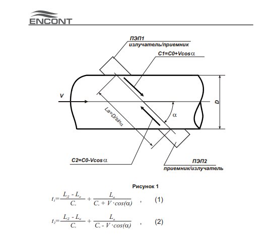 • t1, t 2 - o tempo de propagação do pulso ultrassônico ao longo do fluxo e contra o fluxo