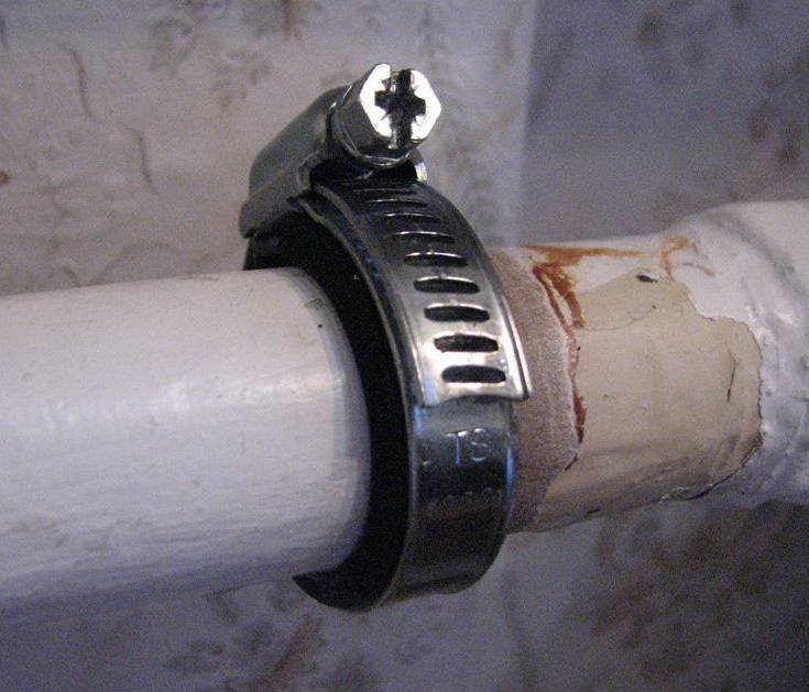 Se a fístula for diretamente no próprio cachimbo, devido ao seu desgaste, a maneira mais fácil de eliminá-la é fazendo um banquinho de madeira. A forma mais econômica de eliminar vazamentos em canos é utilizada há muitas décadas, para isso não são necessários dispositivos especiais, mas sim borracha macia (câmera de bicicleta ou carro) e grampos comuns ou fios de tricô macios. Uma tira de borracha é enrolada firmemente sobre o vazamento e alguns centímetros para os lados, e pressionada com várias pinças ou firmemente fixada com um fio de tricô. Uma das braçadeiras deve ser localizada diretamente no local do vazamento, e mais duas - fixações adicionais.Se por algum motivo não funcionar para eliminar o vazamento do cano com meios improvisados, você terá que ir à loja de encanamento mais próxima e comprar uma bandagem especial composta de borracha grossa e um análogo de uma braçadeira, que envolve o cano em torno do todo o perímetro e é pressionado com parafusos. Devido à área significativa (cerca de 60 mm) desta banda e à força de crimpagem significativa, ela pode ser usada para eliminar quase todos os vazamentos e até mesmo conectar os tubos.