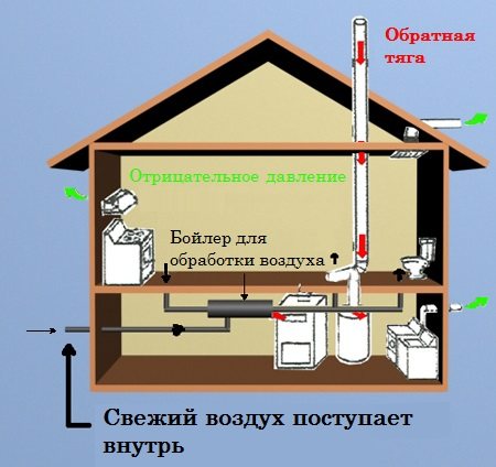 O sistema de ventilação da casa é um complexo de vários dispositivos técnicos, ventiladores e poços, que possuem uma única elevação desde a cave até ao telhado. Graças a ele, a tração é gerada pela diferença de temperatura na casa e na rua. À medida que essa diferença aumenta, o capô trabalhará mais.