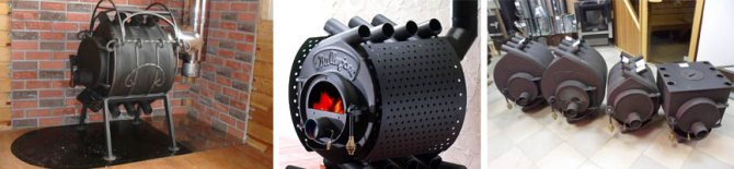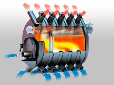 Se um fogão tipo fogão comum aquece devido à radiação térmica de seu corpo, o Buleryan aquece sem um circuito de água devido à convecção. Aqui, tubos de diâmetro suficientemente grande são usados, cobrindo completamente a câmara de combustão. O ar que passa por eles aquece a uma temperatura de + 100-120 graus e entra nos quartos. Este esquema proporciona um aquecimento muito rápido das instalações.