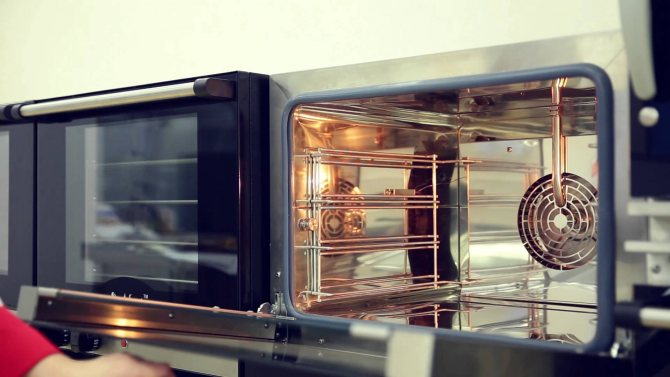 - Equipamento. O equipamento industrial é frequentemente equipado com mais bandejas do que o número de bandejas dentro da câmara de aquecimento, de modo que a distribuição dos alimentos entre a bandeja e o forno é fácil.