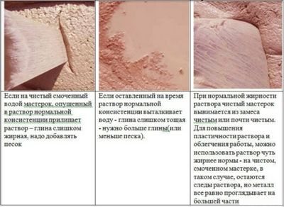 Quando a massa resultante adere quase completamente à pá, significa que a argila tem um alto teor de gordura e precisa ser exaurida artificialmente com a adição de areia. Se a argila permanecer com pequenos coágulos na ferramenta, é ideal para a argamassa e não requer "modificações". Esta etapa pode ser continuada amassando diretamente a mistura de alvenaria, mas a argila deve primeiro ser limpa. Isso também se aplica à areia, que deve ser lavada.