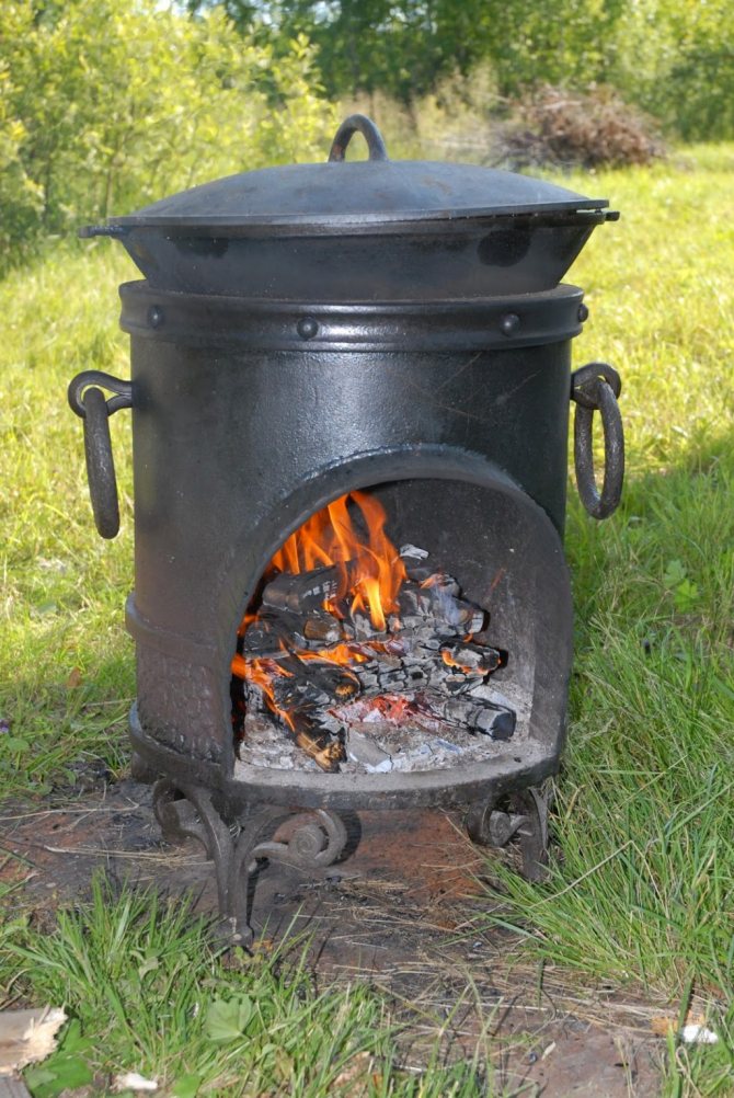 Além disso, uma churrasqueira estacionária sob o caldeirão funcionará de forma mais eficiente e econômica em termos de manutenção. Se você planeja organizar encontros principalmente no território do local, é melhor parar por esta opção.