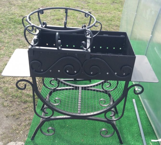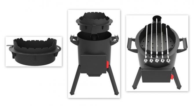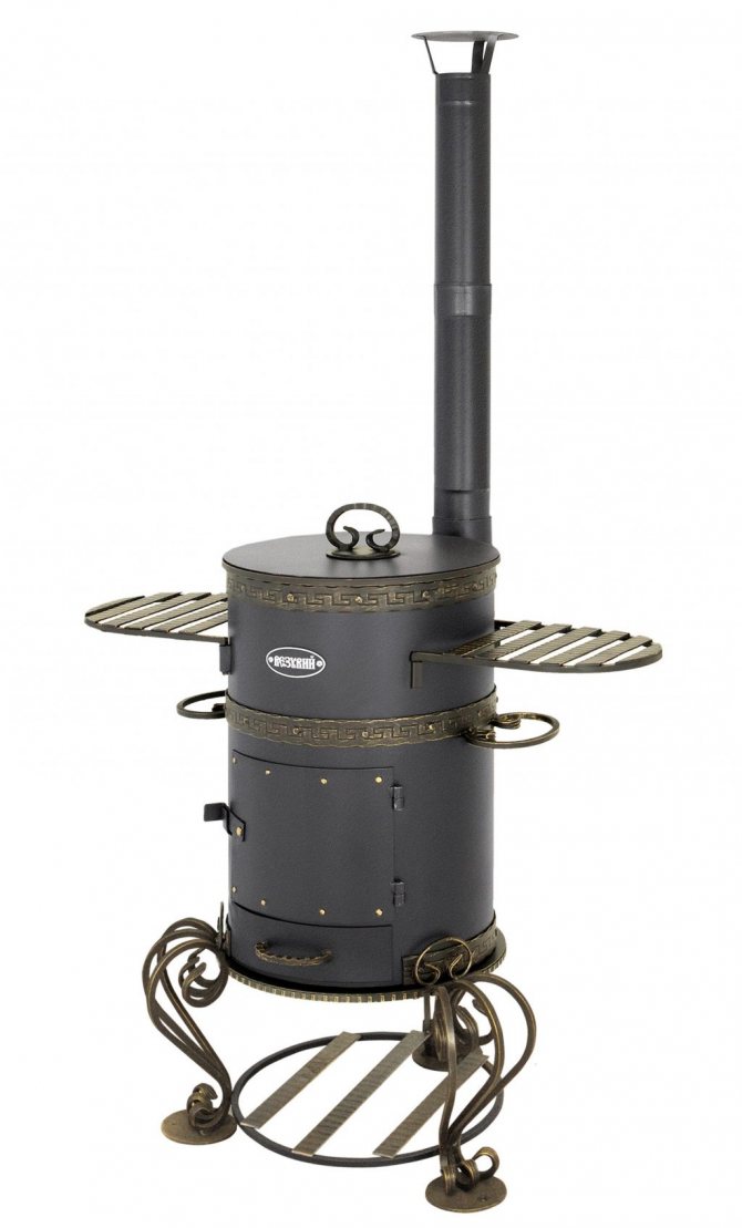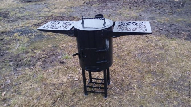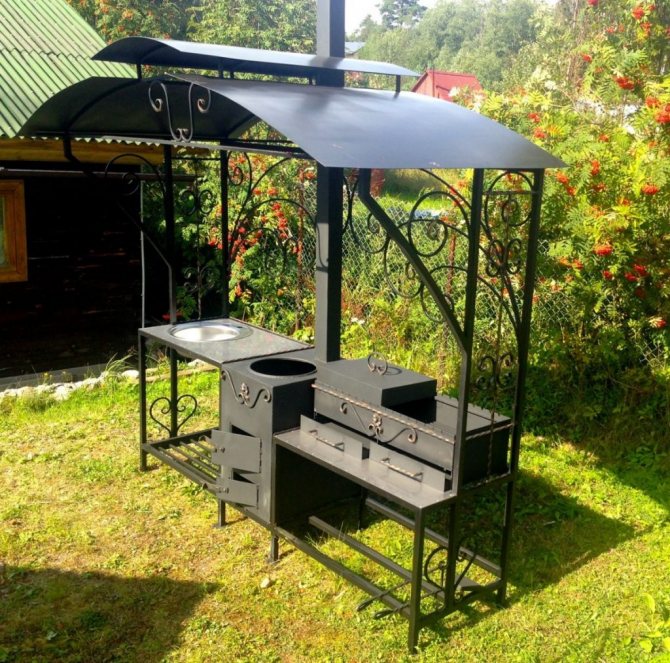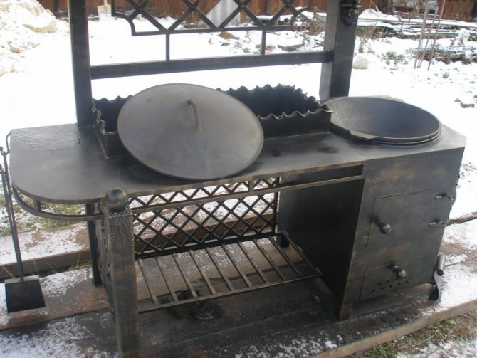 Um braseiro de metal com um fogão sob um caldeirão e um fumeiro é um complexo muito útil, pois permite cozinhar não só kebabs, mas também sopa de peixe, um conder turístico, cozinhar sopas e até começar a cozinhar pratos asiáticos.