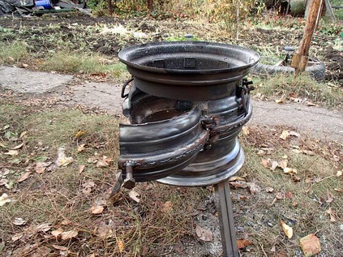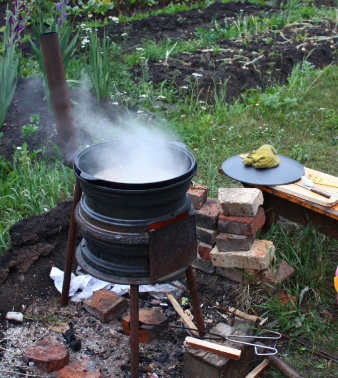 - O braseiro sob o caldeirão da versão móvel é feito de discos automotivos conectados uns aos outros até que a altura desejada seja obtida.