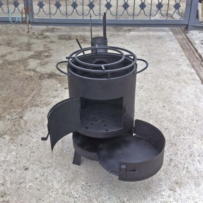 Como uma grelha, você pode usar o fundo com orifícios perfurados ou instalar uma grelha fabricada separadamente. Toda a estrutura, se não houver um cinzeiro, deve ser montada sobre pés. Este algoritmo pode ser usado na construção de um forno a partir do corte de tubos de diâmetro adequado. Como resultado, você receberá um dispositivo portátil com o qual será conveniente instalar um caldeirão e cozinhar vários pratos nele.