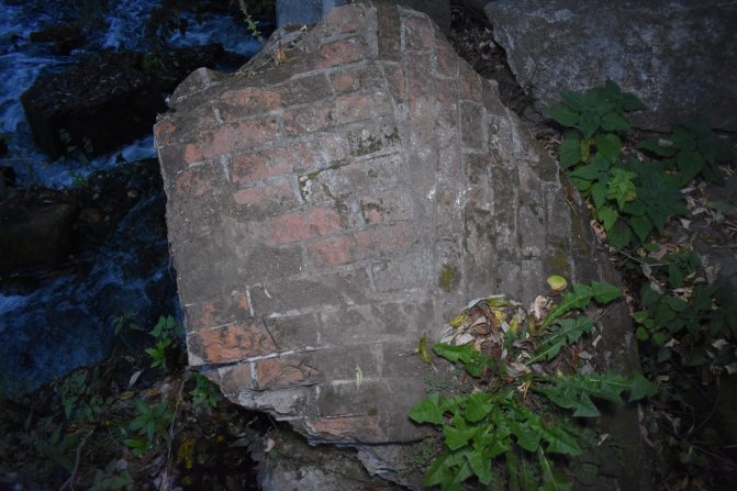 É verdade que, neste lugar, o rio se parece apenas com um riacho, e a própria platina, no momento, é apenas um bloqueio de pedras e pedaços de lajes de concreto. No entanto, neste entulho, existem blocos de tijolos antigos, empilhados aqui durante a demolição de estruturas antigas.