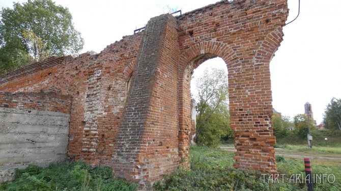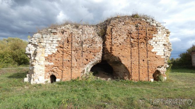 O fato de o prédio estar cheio pode ser visto claramente de sua extremidade, do lado do tanque.A altura e a largura do arco não são proporcionais e a porta é perfurada acima do arco. Na parte de trás da porta, há uma única dobradiça e, a julgar pela largura do arco, a segunda, um pouco mais baixa, tem dois metros.