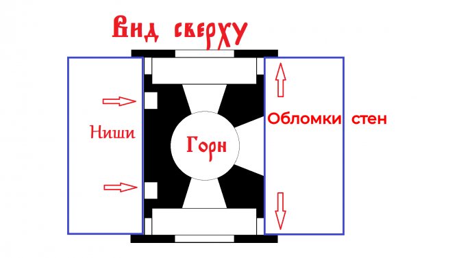 Mas isso não é toda a evidência de um fogão com enchimento. De acordo com a tecnologia do alto-forno, a forja, com metal líquido, está localizada abaixo das ventaneiras, e os volantes, ao longo dos quais o metal fundido flui para fora do forno, estão localizados bem no fundo da forja, o que é lógico , já que o ferro flui por gravidade.