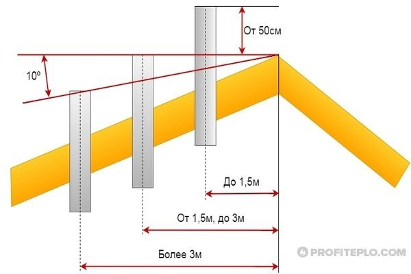 - Os especialistas recomendam mover a chaminé para qualquer um dos lados do cume. E o tubo deve se elevar acima dele em pelo menos 50 cm, se a distância entre eles for de até um metro e meio.