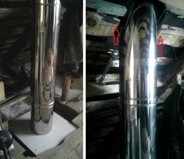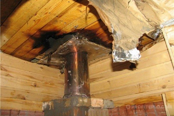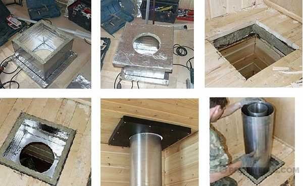 O tubo de aço de camada única fica muito quente. Portanto, a abertura do teto, onde foi utilizada uma árvore para construção, deve ser equipada com uma barreira de isolamento térmico ou uma caixa especial. Assim, atuam não só em pisos de madeira, mas também em qualquer outro.