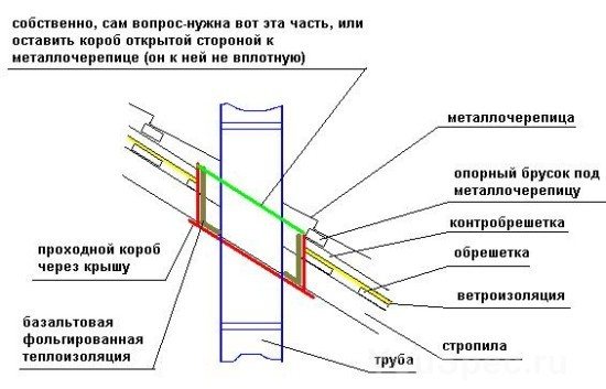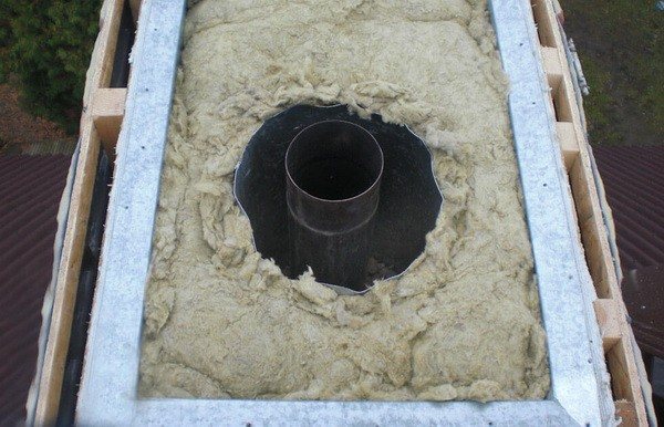 Em outras palavras, você precisará criar uma caixa de madeira que separa o cachimbo do bolo da cobertura e instalar um cachimbo de chaminé nela. Neste caso, a distância das paredes da caixa ao próprio tubo deve ser arranjada de acordo com as regras do SNiP, e o espaço entre as paredes e o tubo deverá ser preenchido com material isolante térmico não combustível, por exemplo, lã basalto, que é mais frequentemente usada para esses fins.