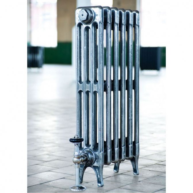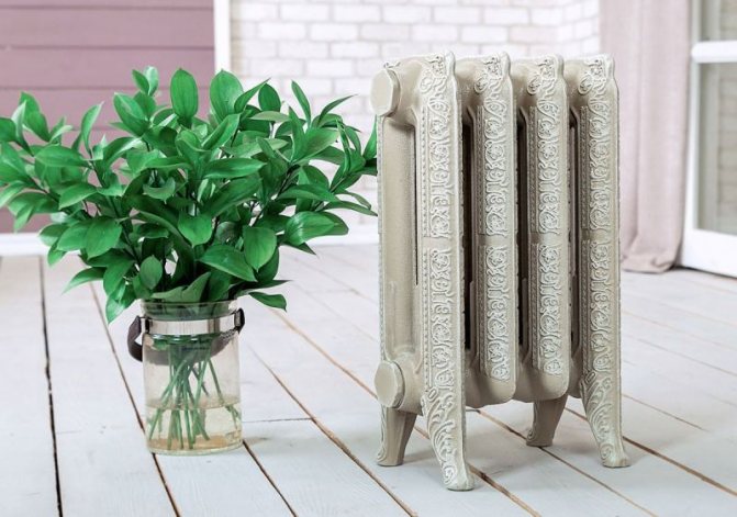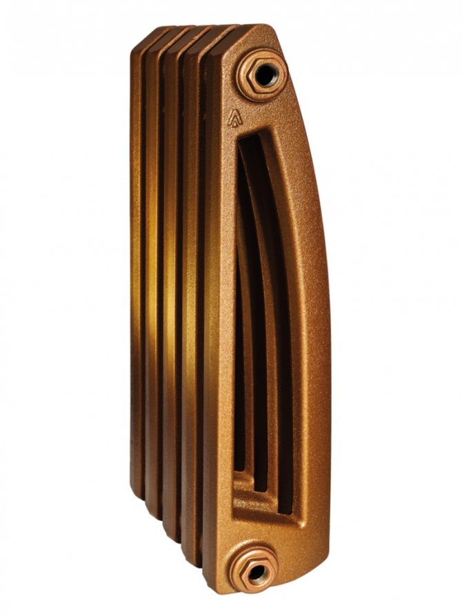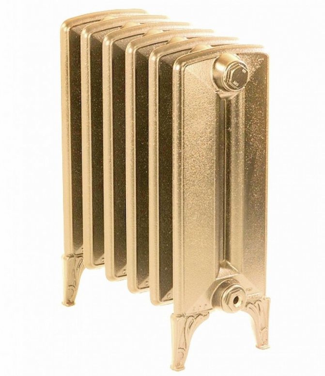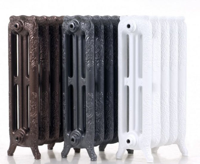 - As estruturas de ferro fundido agora parecem elegantes, mas também são montadas a partir de seções equipadas com um canal bastante largo para o refrigerante. Seu peso ficou muito menor (3,5 kg versus 8 kg antes), a aparência é apresentável e a confiabilidade é a mesma. No mercado existem modelos seccionais clássicos e artísticos, no estilo retro. Estes últimos são muito caros e, em sua maioria, importados.