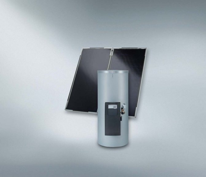 - Abrir. Representar recipientes planos oblongos pretos cheios de água... É aquecido pelo calor do sol e pode manter a temperatura da água em piscinas externas, chuveiros externos e muito mais. A eficiência de tais dispositivos é extremamente baixa, então eles só podem ser usados no verão.