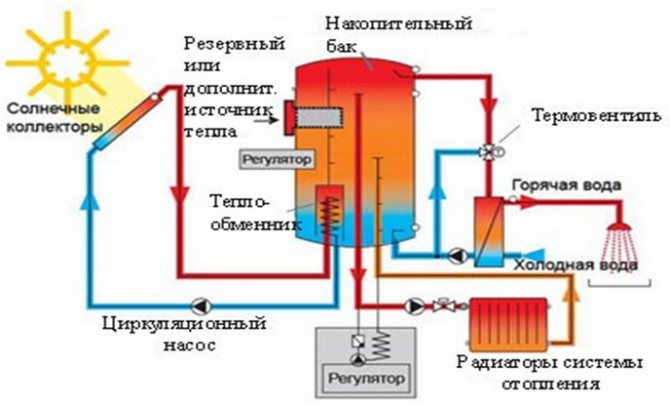 Os sistemas de circuito duplo são mais complexos... O líquido refrigerante que aquece no coletor é direcionado para uma bobina instalada dentro do tanque de armazenamento e emite energia térmica, após a qual entra novamente no coletor. A água aquecida do tanque é fornecida aos pontos de análise (banheiras, pias e outros encanamentos) e também é direcionada ao circuito de aquecimento. Resfriando nele, ele novamente entra no tanque, onde é aquecido a partir da bobina. Normalmente, o anticongelante circula dentro da linha do coletor, uma vez que os fluidos não se misturam, ou seja, o aquecimento da água ocorre de forma indireta.