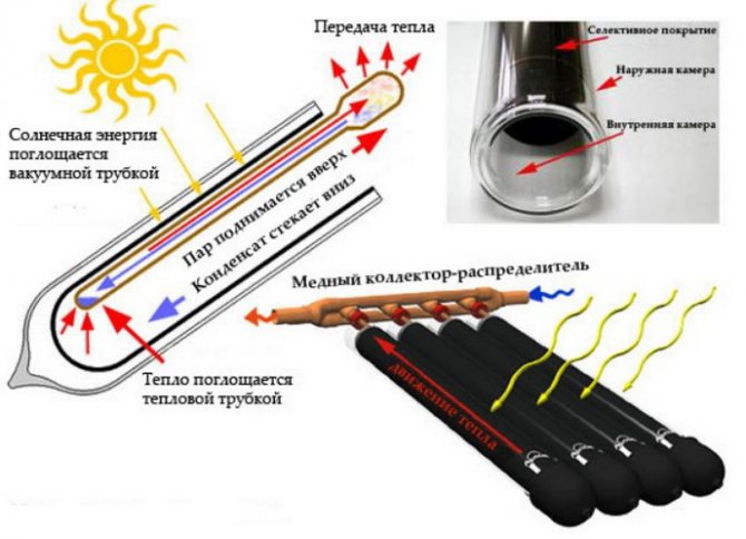 Existem também tipos mais modernos de colecionadores, nos quais o princípio de uma bomba de calor é usado - há um líquido volátil em um recipiente selado. Quando aquecido pelo calor do sol, ele evapora. Esse vapor sobe para a câmara de condensação e se instala nas paredes, liberando muita energia térmica.No outro lado das paredes é criada uma camisa de água, que recebe este calor e é enviada para o sistema de aquecimento.