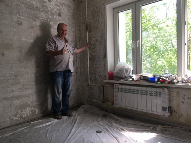 O processo de substituição dos canos foi dificultado pelo fato de que em nossa casa os canos de aquecimento estão embutidos nas paredes. Aqui está uma teoria. Portanto, o desmantelamento de canos antigos poderia muito bem ter zerado os reparos em todos os apartamentos. Portanto, decidimos prescindir de grandes perdas e não tocar nas velhas tubulações das paredes. Eles decidiram instalar novos canos dentro do apartamento perto das paredes. Tubos de metal antigos eram cortados o mais próximo possível da parede com um esmeril. Posteriormente, ele precisará ser reparado para que não fique visível.