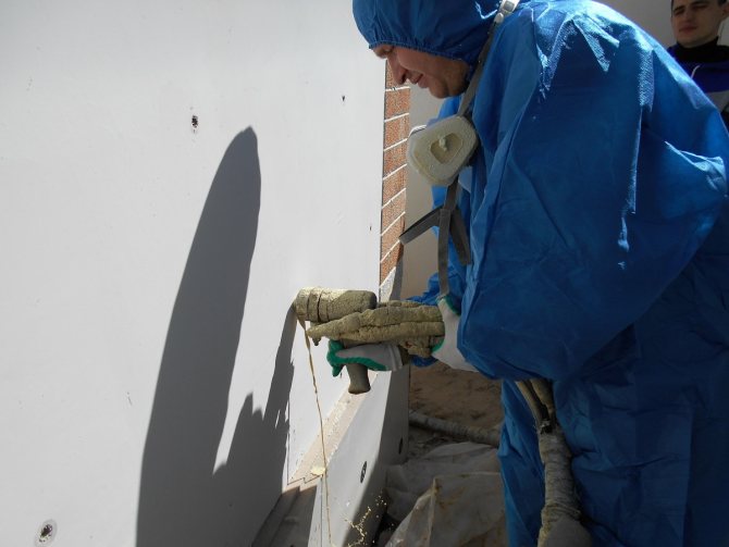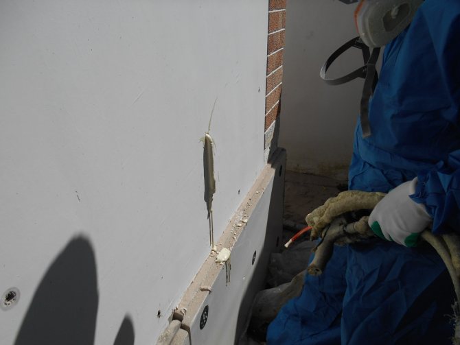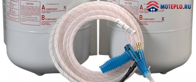 A espuma PU é fornecida ao local na forma de dois componentes líquidos, marcados com as letras A (poliol) e B (isocianato). Antes de proceder à mistura dessas substâncias e despejar a mistura na cavidade, o poliol deve ser aquecido a 30-350C e o isocianato a 40-500C. Em seguida, o componente A é misturado por 10-15 minutos até ficar homogêneo. Fazemos tudo isso em uma unidade hidráulica especial com sistema de aquecimento embutido e mangueiras aquecidas. Com o auxílio de uma pistola, a composição de espuma de poliuretano é introduzida na fenda da parede, onde se expande e preenche o espaço vazio entre as superfícies limitantes, bem como as menores fissuras, defeitos de alvenaria ou lajes.