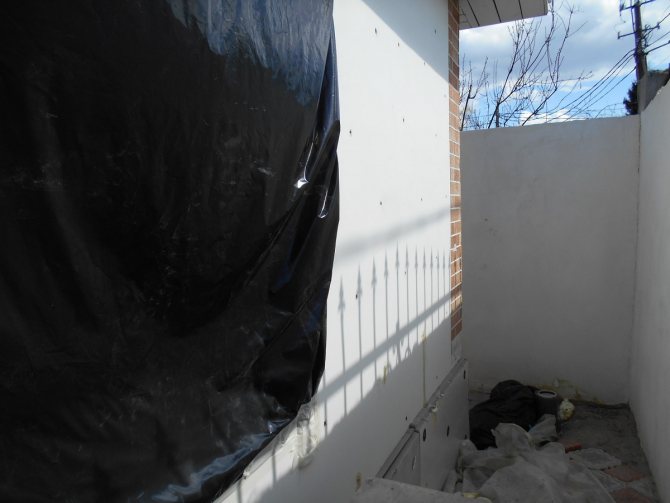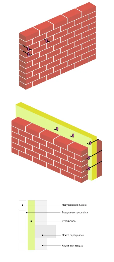 A utilização de tamanha quantidade de tijolos torna-se impraticável devido à carga sobre a fundação e à complexidade da instalação, pois as paredes são de duas camadas. Interno e externo são erguidos, deixando um espaço de 50 centímetros entre eles para a livre circulação de ar. Isso ajuda a reter o calor e evitar a formação de condensação. Mas isso não é suficiente para um isolamento completo. É difícil isolar o espaço entre as paredes com materiais laminados ou macios. O método de preencher os vazios com espuma PU permite preencher uniformemente todas as lacunas dentro das paredes e entre elas.