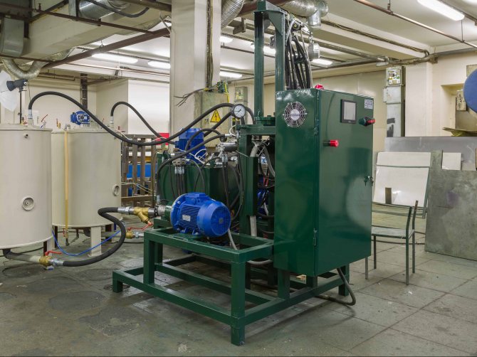 Para verter as paredes do PPU, são usados complexos para verter. Esse equipamento permite dosar com precisão os componentes para obter espuma de poliuretano, misturá-los até ficar homogêneo e despejá-los no espaço entre as paredes. As instalações são de alta pressão (acima de 100 atmosferas) e baixa pressão (4-10 atmosferas).