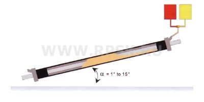 Ao despejar de cima, os tubos pré-montados também são posicionados em um ângulo de 1 ° a 15 ° com a horizontal (ver Fig. 2.). No entanto, neste caso, a quantidade necessária de mistura de espuma é introduzida na área entre o tubo de aço e o tubo de HDPE através de uma abertura na tampa superior. A força da gravidade faz com que uma massa de viscosidade relativamente baixa flua para baixo do tubo. A velocidade desse fluxo depende do ângulo em que os tubos estão localizados, quanto maior, mais rápido a massa flui para baixo. Este método também assume uma distribuição inicial de espuma ao longo do tubo, antes que a espuma se expanda rapidamente. A espuma preenche ainda mais o tubo do centro às pontas. A experiência tem mostrado que a melhor distribuição de propriedades é obtida quando a espuma atinge o respiradouro inferior aproximadamente vinte segundos antes do topo. Naturalmente, imediatamente a seguir, os orifícios de ventilação são vedados.
