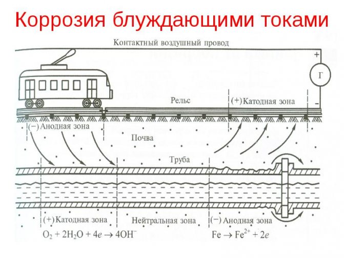 Този процес се причинява от така наречените бездомни течения, които се появяват в земята, ако тя действа като проводяща среда. В този случай не само метални предмети, които са напълно в земята, са подложени на разрушителен ефект, но и тези, които само влизат в контакт с него. Но откъде идват тези течения? Това е просто: в повечето случаи появата им е резултат от течове от електропроводи. Тази група включва също така наречените нулеви токове, присъстващи в незаземени структури.