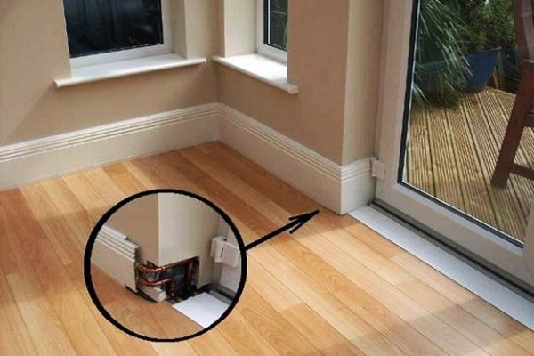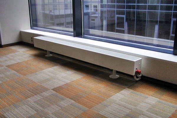 Такива конвектори за первази, които виждате на снимката, и други подобни, също се наричат топли или отоплителни первази, но те все още не са се утвърдили у нас (такива модели са най-широко разпространени в САЩ и Канада). Основното, което поразително е тук, са размерите на устройството: височината е само 20-25 см, а дълбочината е 10 см! Както всеки перваз, те са фиксирани към стената.
