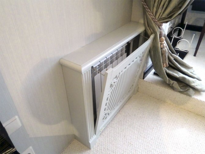 - Имайте предвид, че преносът на топлина от затворен радиатор във всеки случай е намален, който и метод на камуфлаж да изберете. Основното е, че промяната не е значителна. В идеалния случай спадът на температурата в стаята трябва да бъде около 1-1,5 градуса.