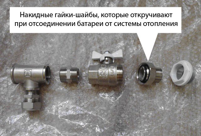 На подаването и връщането на топла вода в радиаторите са монтирани съединители с съединителни гайки, към които отгоре е прикрепен клапан за регулиране на водата, а отдолу спирателен вентил. След двата крана се монтират съединители с външна или вътрешна резба. И след освободените съединители се инсталират или американски съединители със затягащи гайки, или съединители за кримпване. По един или друг начин, захранващите и връщащите отоплителни тръби са свързани към последните.