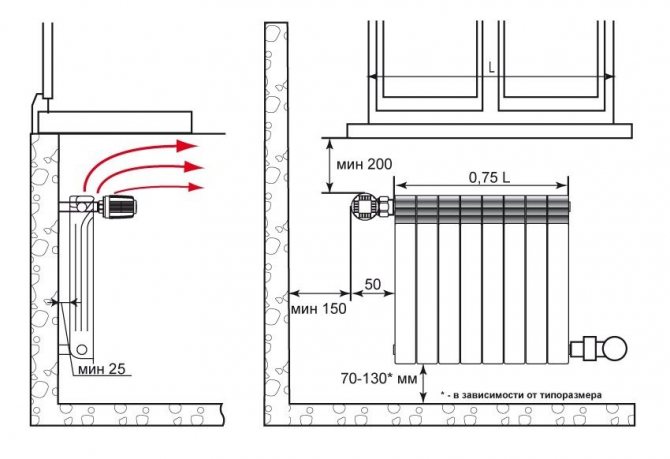 Минималните пропуски по периметъра на радиатора не трябва да са по-малки от 50 мм, но всичко зависи от размера на перваза на прозореца, дълбочината на нишата, дизайна на батерията и мястото на нейното инсталиране.