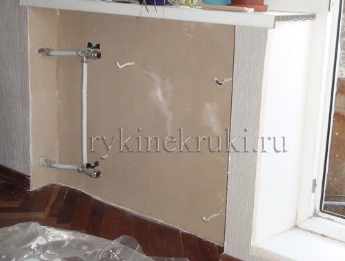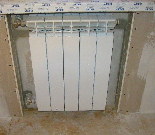 Много по-лесно е да осигурите желаната вдлъбнатина, като удавите радиатора в кутия от гипсокартон. След това е възможно да се направи ниша с всякакъв размер и да се скрият изходящите тръби под листовете.