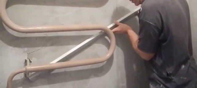 Измазването на стените зад батерията, без да се отстранява, няма да работи напълно. Тоест, можете да извършите измазване с циментово-пясъчен разтвор, но без фугиране. Ще е необходимо окончателно да се изравнят стените зад радиатора с шпакловка. За нанасяне на мазилка или шпакловка се използва алуминиева лента с дължина 150 см или повече и ширина само 3-5 см. Дебелината на лентата трябва да бъде около 4-5 мм, така че лентата да не се огъва по време на работа .