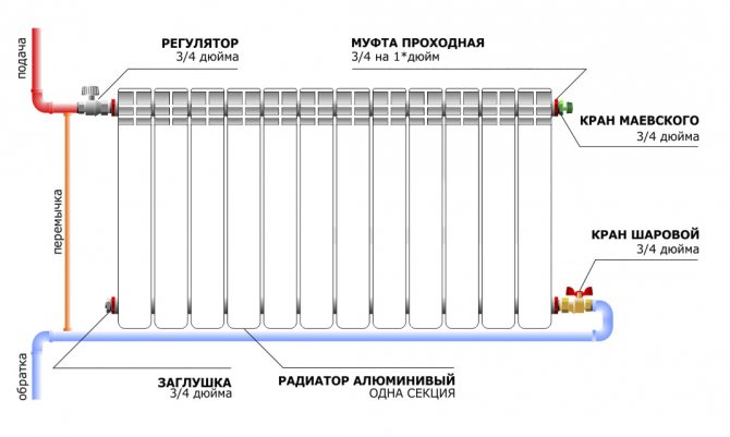 Всички радиатори, както алуминий, чугун, така и други материали, имат един и същ принцип на свързване. Независимо от броя на секциите, батерията има кран, който регулира подаването на топла вода, възвратен спирателен кран и кран на Маевски - въздухоотвод, предназначен за освобождаване на въздушна брава от радиатора.