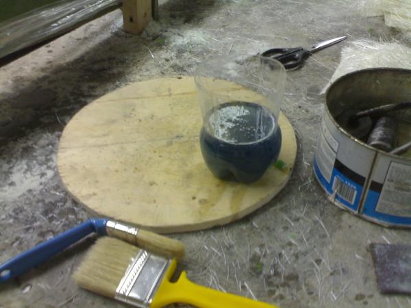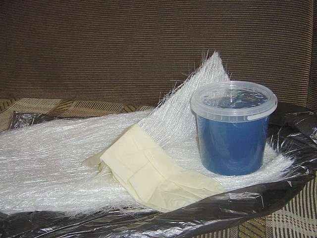 Готова е основата, от която ще направим нова част. Сега трябва да залепим фибростъклото. За целта вземаме полиестерна смола и я разреждаме с втвърдител в необходимото количество, като спазваме пропорциите. Нека ви напомня това пропорции на разреждане на полиестерна смола са 2: 100, т.е. на 100 гр. полиестерна смола, ви трябват само 2 гр. катализатор (втвърдител). Необходимо е стриктно да се придържате към тези пропорции, в противен случай можете да развалите всичко !!!