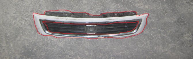 След като извадим скарата от колата, трябва да направим матрица за бъдещия продукт. На снимката по-долу с молив очертах онези части, които трябва да бъдат залепени. Внимание !!! Преди да работите с композитни материали, не забравяйте да покриете добре детайла с лента. За да направите това, по-добре е да използвате два вида лепяща лента, маскираща лента и обикновена прозрачна. За какво??? В процеса на полимеризация на материалите възниква химическа реакция, която е придружена от нагряване на материалите. След като вече се сблъсках с такъв феномен при производството на мигли за фарове.Работата доведе до повредени фарове. Ето защо, като се поучих от тези грешки, експериментирах и стигнах до заключението, че ако първо залепите прозрачна самозалепваща лента и след това рисувате върху нея, тогава нищо няма да се случи с повърхността на пластмасата или лаковото покритие.