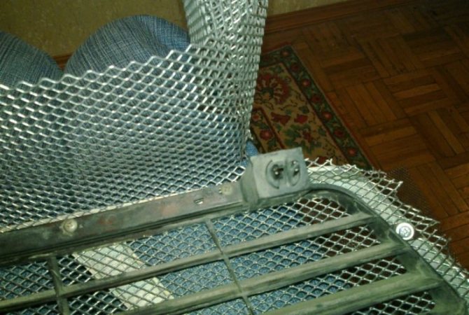 В този случай е монтирана предната решетка „направи си сам“ на отоплителния радиатор. Това е един от най-простите дизайни, тъй като може да бъде прикрепен както към батерията, така и към стената.