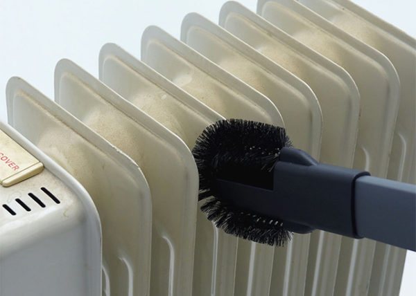 - Използвайте прахосмукачка. Ако той бъде допълнен с тясна дюза, ще ви бъде полезен при почистване на отоплителни устройства. Първо отстранете целия прах от вътрешната страна, след което внимателно обработете външната повърхност. След тази процедура можете да избършете радиатора с влажна кърпа.